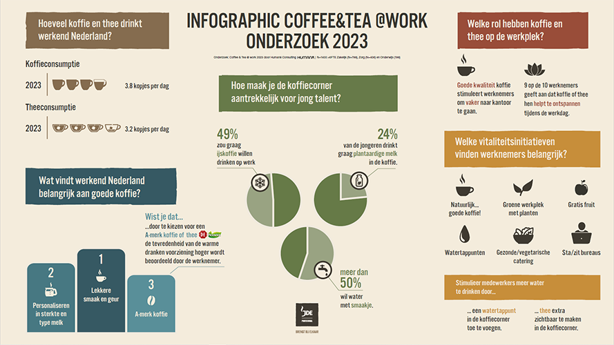 En dat is niet de enige ontwikkeling die opvalt. Werknemers drinken naast koffie, gemiddeld 3,8 kopjes per dag, steeds vaker water en thee, gemiddeld 3,2 kopjes thee en 4,4 glazen water per werkdag. Bovendien zou meer dan de helft (56%) van de werknemers graag (caloriearm) water met een smaakje drinken op kantoor.